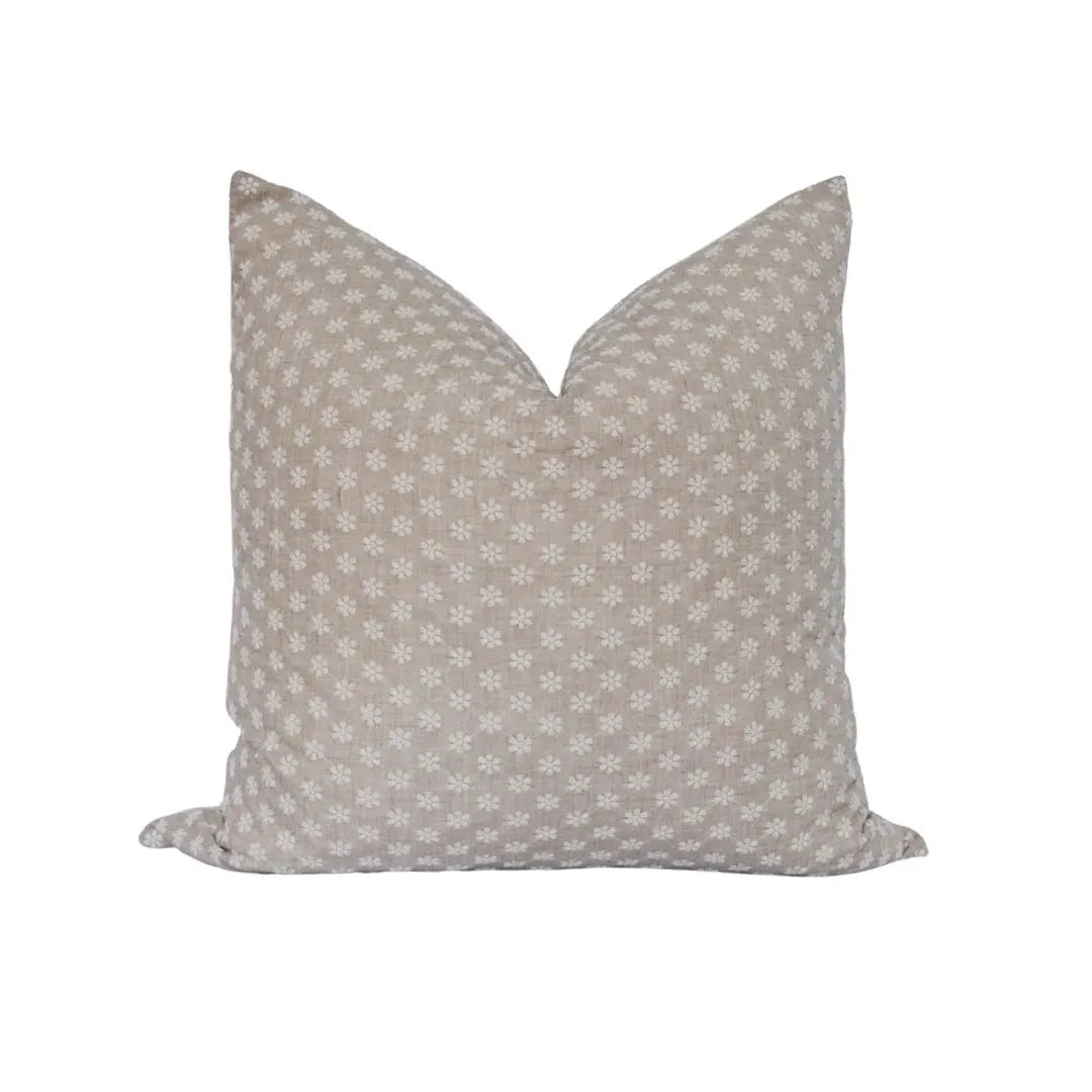 A natural linen, embroidered printed throw pillow cover backed in a cream canvas with a zipper closure.