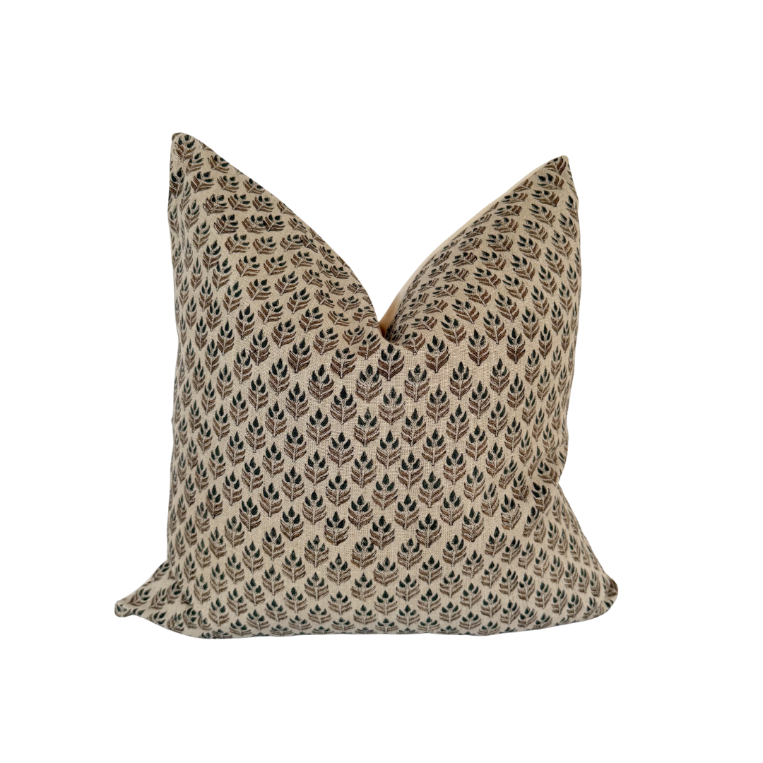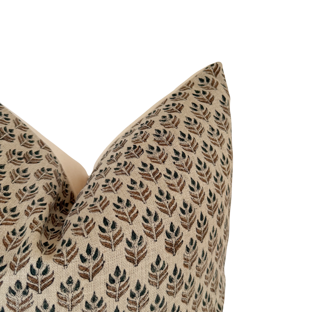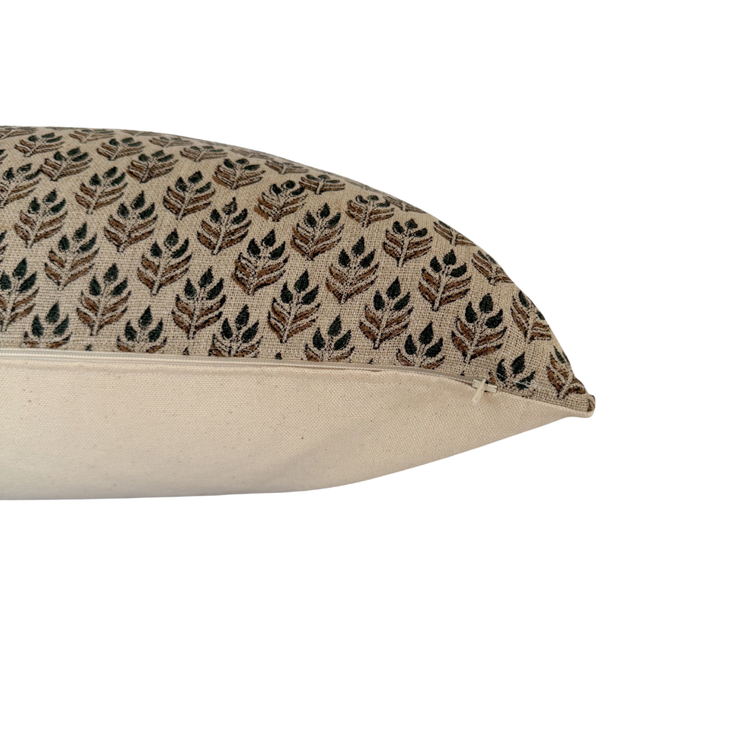 A natural linen hand block printed throw pillow cover backed in a cream canvas with a zipper closure.