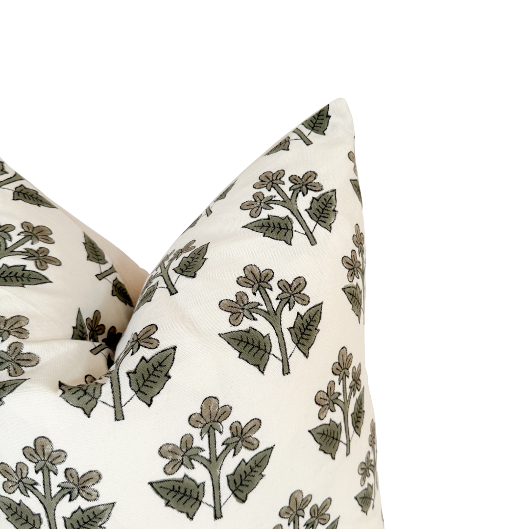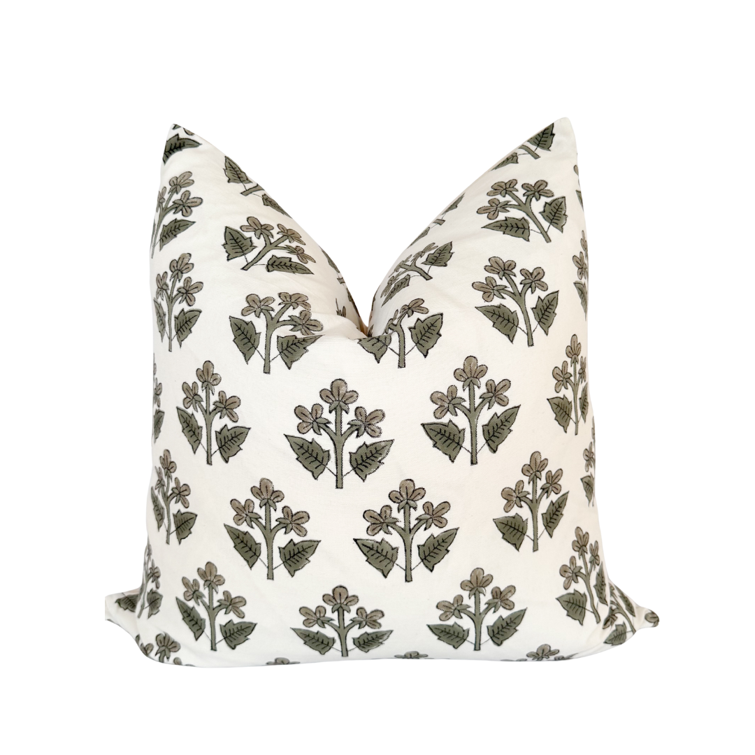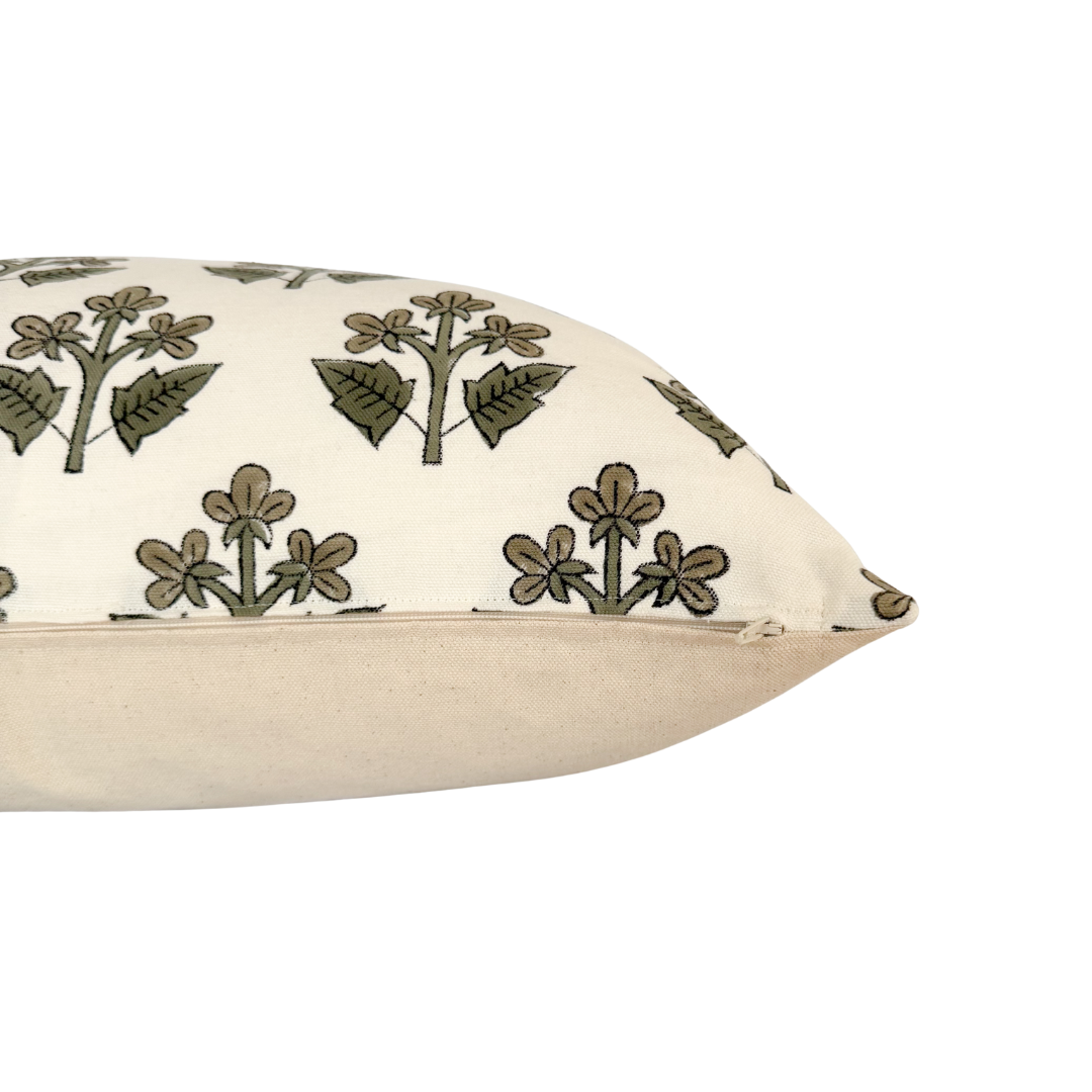 A white cotton hand block printed throw pillow cover backed in a cream canvas with a zipper closure.