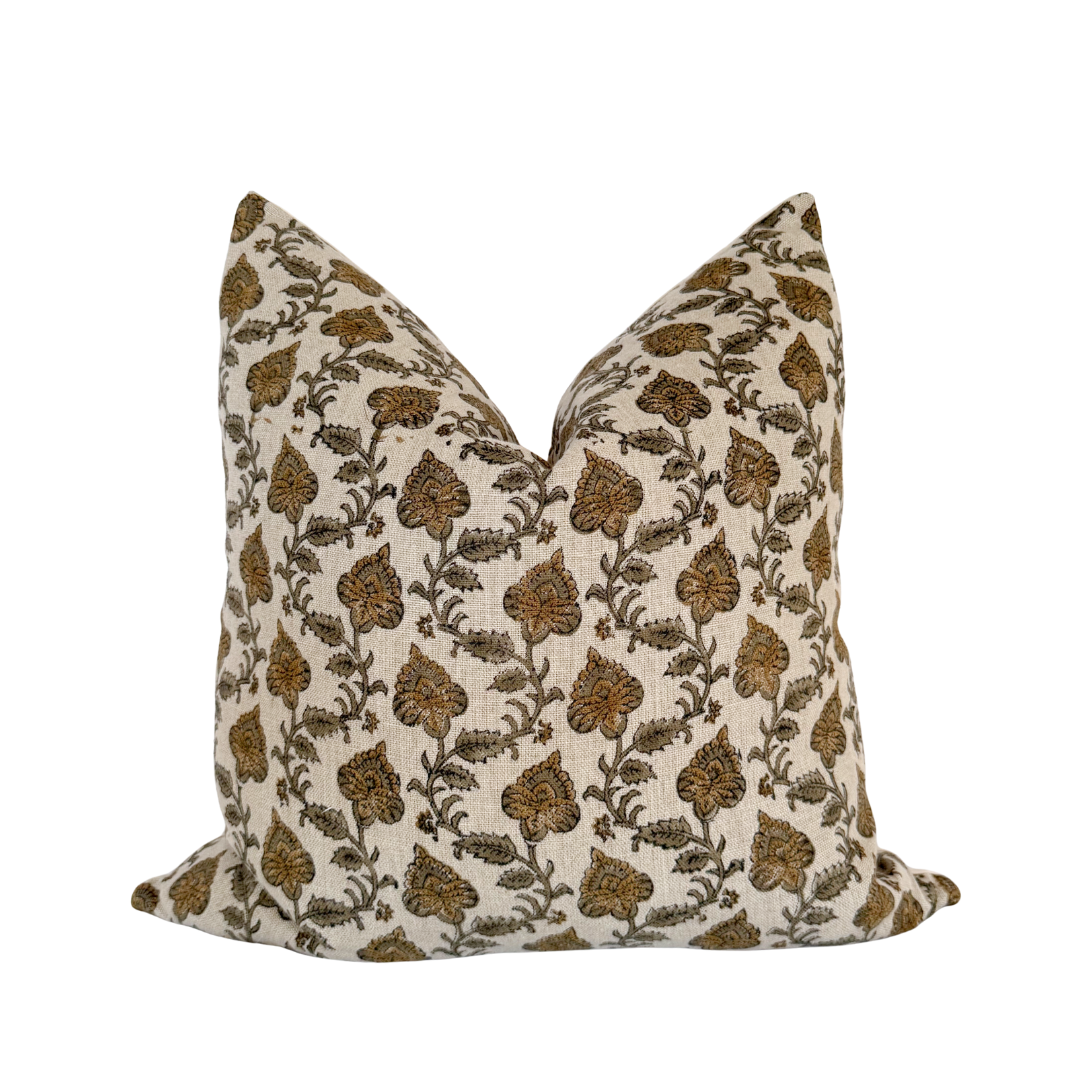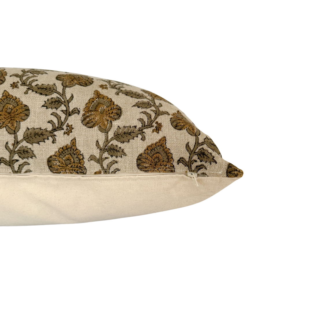 A natural linen hand block printed throw pillow cover backed in a cream canvas with a zipper closure.
